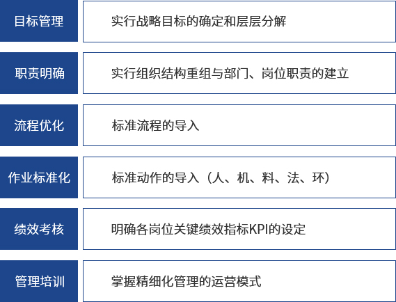 1、组织架构设定; 2、岗位职责和工作职能规划; 3、流程建立与优化; 4、制度建设。 |
