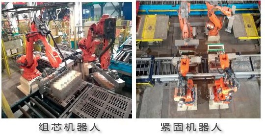 制芯工序是铸造工艺中较复杂的工序,人为影响因素最多,像发动机缸体、缸盖砂芯,砂芯种类杂、流程多,工艺复杂,同时砂芯重量重,组芯要求精度高,利用工业机器人完全满足高效率、高质量的生产过程。