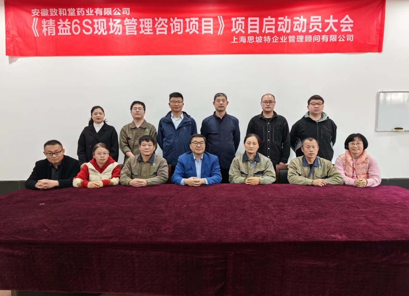 2023年3月30日安徽致和堂药业有限公司精益6S现场管理咨询项目隆重启动。本次精益6S现场管理项目将极大提升公司现场管理水平,为员工创造良好的工作环境,规范试验和生产作业管理,为公司的管理升级提供强有力的保障,使公司获得新的发展动力!